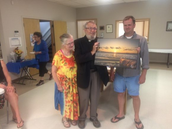 Fr. Don and Julia Flummerfeld are presented with a gift painting by the local Anglican Pastor on the occasion of the retirement event at Assumption Parish, Hay River.