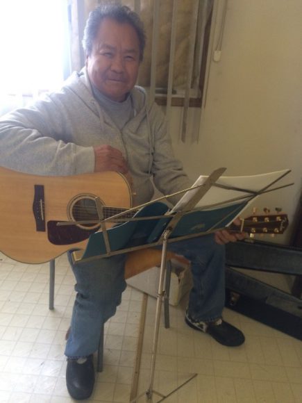 Alex Tambour – elder from St. Ann’s, Katlodeeche – plays guitar during the Confirmation ceremony.