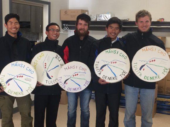 At the end of the Tulita project, members of the community present the work team members of hand-made drums and jackets at a celebration of thanksgiving and sending. The members are: Douglas Pham; Peter Dai Nguyen; Roman Blain; Patrick Le; Joseph Bennoit.